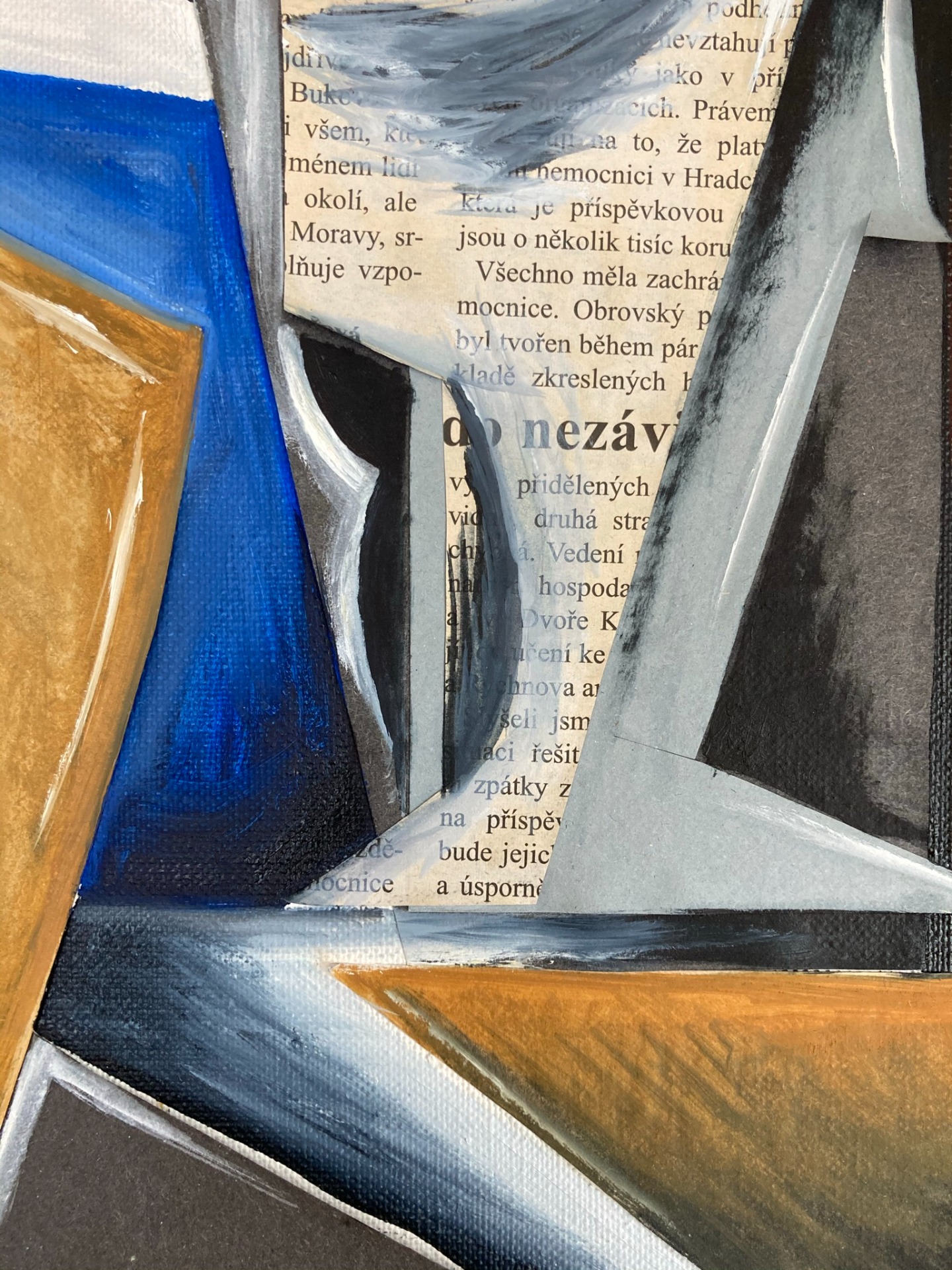 Olej, papír a noviny na plátně, rozměry 40x30cm